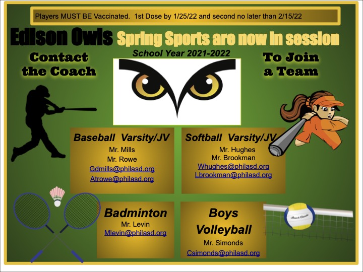 Edison Athletics 2021-22 Info Sheet <–Click here to open the page with links, you’ll be able to access forms and email coaches directly from the page. Have fun!